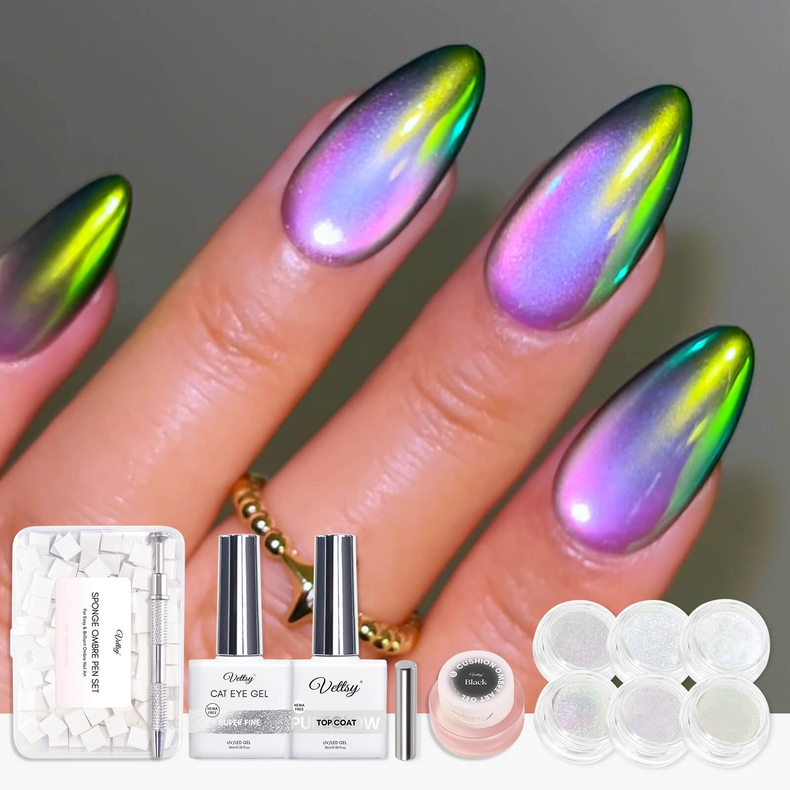 Featuring cat‑eye gel, cushion ombre gel, mermaid nail powder, plus magnet and sponge, this nail art tool kit is designed to help you craft flawless looks in minutes. Whether you’re going for a solid cat‑eye, a natural ombre, or the ultra-shiny chrome finish, each component can be used individually or combined to recreate the stunning Instagram styles you love. From day-to-night with glossy, dynamic cat eye effect, this kit ensures professional results at home—no need to hunt for matching items—saving you time and the fragrance of guesswork.
