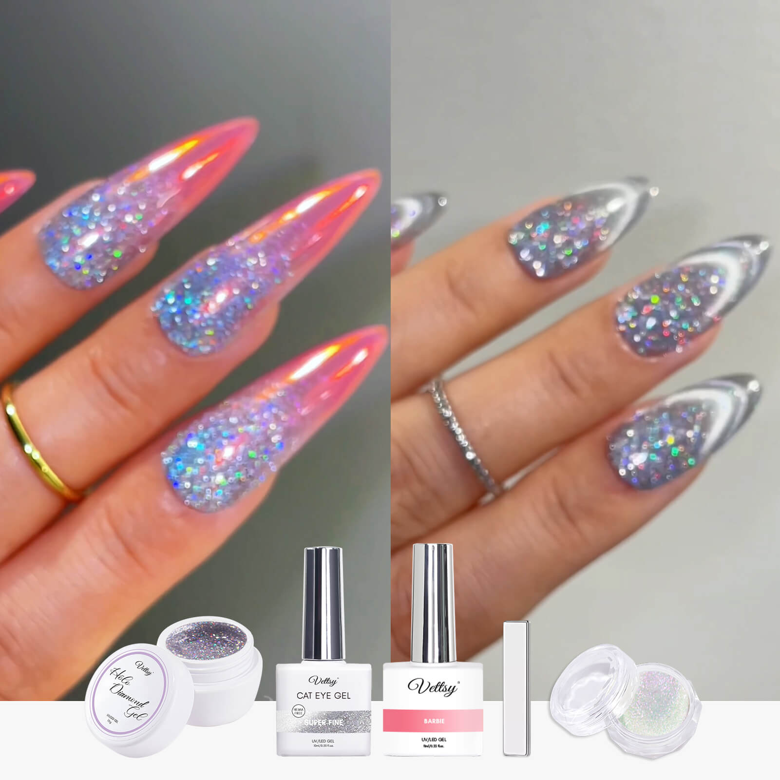 Upgrade your nail art game with Vettsy’s Holo Diamond Nail Trend Set. Perfect for creating stunning designs that will turn heads wherever you go! From chic Holo French glitter nails to sweet holographic Barbie ombré nail design, and dazzling reflective French cat eye manicure, this kit has it all. Enriched with colorful sequins and reflective powder, the laser gel in this set ensures your nails will sparkle and shine under any light. Use the gels and other products you had with the chrome powder, cat eye gel, holo glitter gel, and a range of gel polishes in this nail kit, the possibilities for unique and breathtaking designs are endless. Whether it’s a casual outing or a special occasion, let your nails steal the spotlight with this all-inclusive set and embrace the artistry of reflective glitter nail designs.