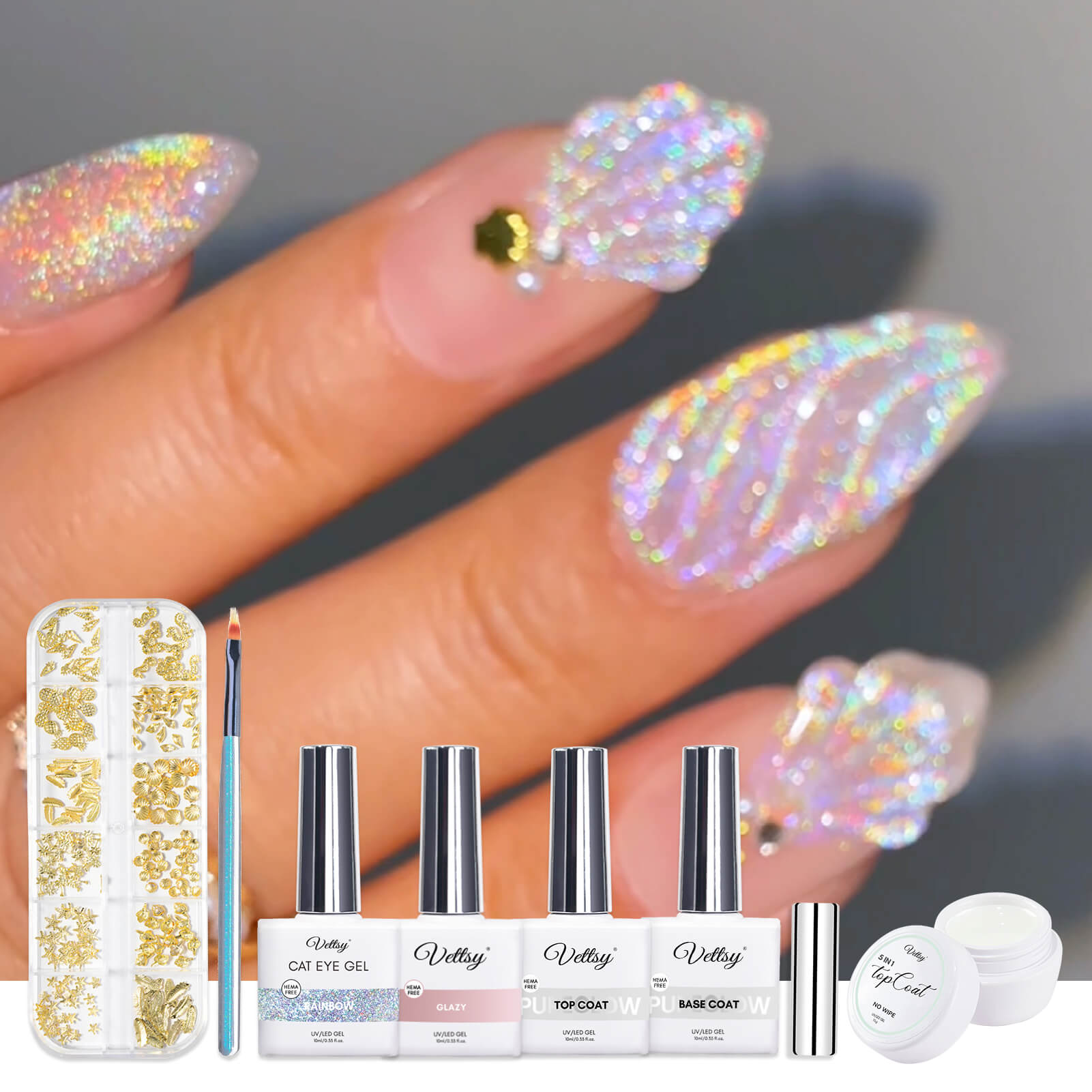 Dive into the enchanting world of summer nail art with our 3D Mermaid Dream Holographic Cat Eye Nail Art Kit! This dazzling nail art kit lets you recreate sweet 3D mermaid shell nails easily. Stunning nude base adorned with a dreaming rainbow cat’s eye effect and 3D shell designs. Perfect for summer vacations, travel, and parties… The gold marine-style metal charms add the final touch of oceanic elegance. Whether you’re treating yourself, gifting family members, or friends, this all-inclusive set is a good choice for you. Get everything you need to craft the ultimate mermaid-inspired manicure and be a beautiful mermaid princess this summer. 🧜♀️🌊