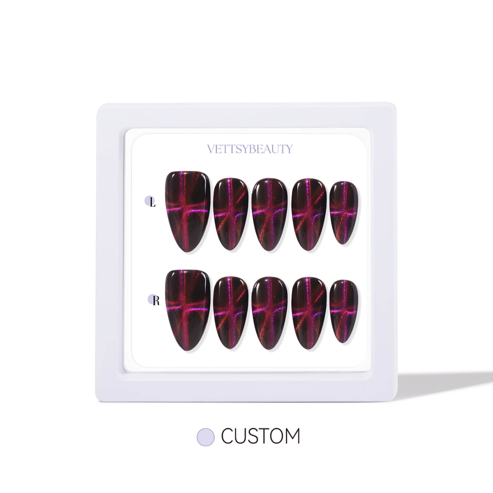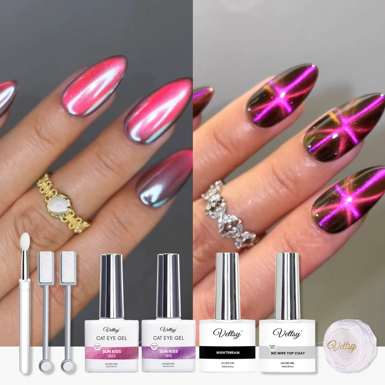 This set empowers you to create a variety of stunning cat’s eye effects that are all the rage, from the mesmerizing aurora cat’s eye to the chic two-color cat eye and the captivating dynamic black hole cat eye effects. 2 premium cat eye gels, versatile black color gel, and the essential magnetic tools to craft popular nail styles like starburst cat eye nail design, cross magnetic nails.