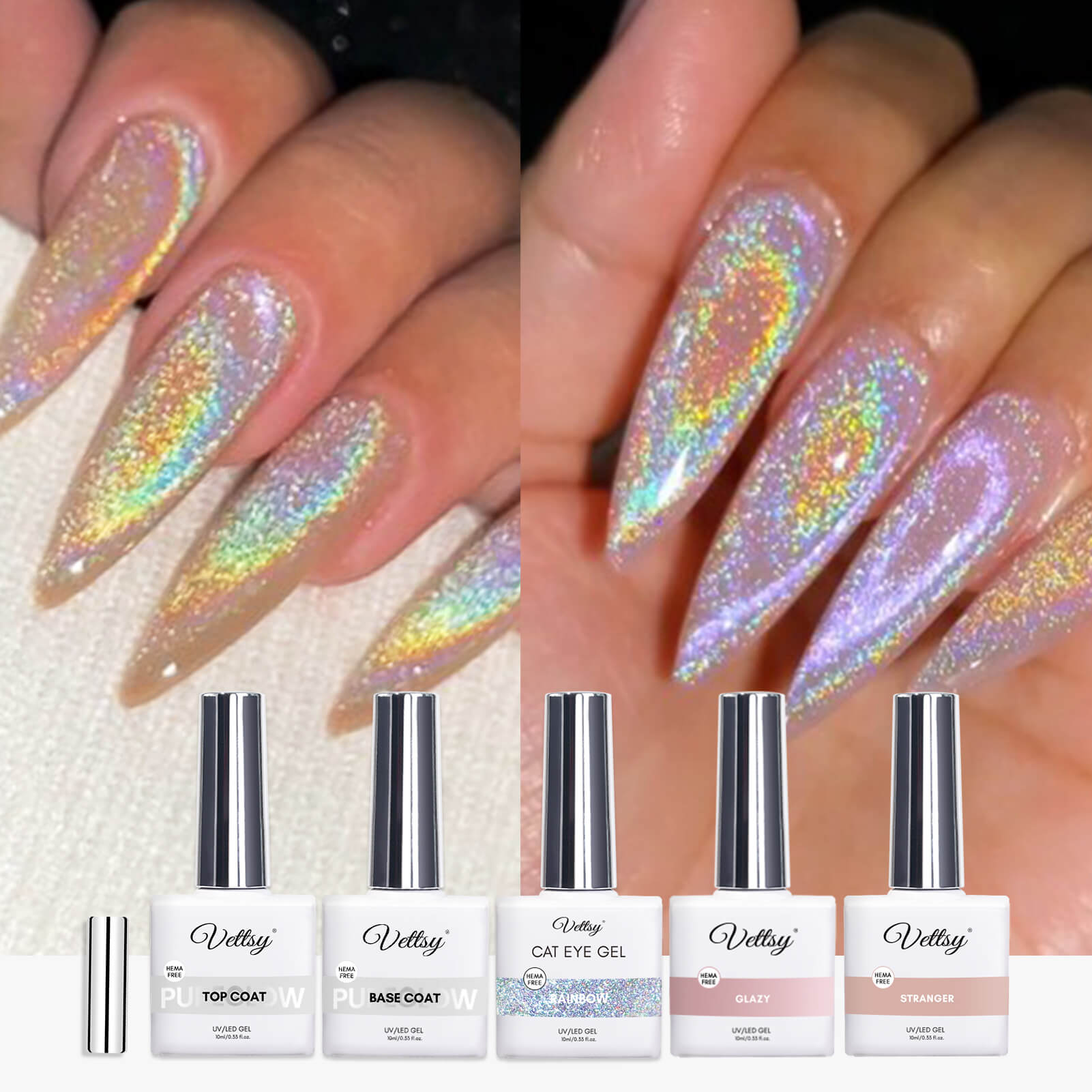 Get ready to make your nails the center of attention with our Rainbow Cat Eye Gel Polish Set–your ticket to dazzling holo nail art! This set includes our rainbow cat eye gel, smooth base colors, and powerful magnet that let you effortlessly create shimmering rainbow cat’s eye effects. Whether you’re in the mood for subtle nude elegance or bold neon vibes, this set delivers nails that shift, sparkle, and captivate under every light. The mesmerizing cat’s eye effect dances across your nails, creating a trendy, eye-catching look that’s perfect for any season.