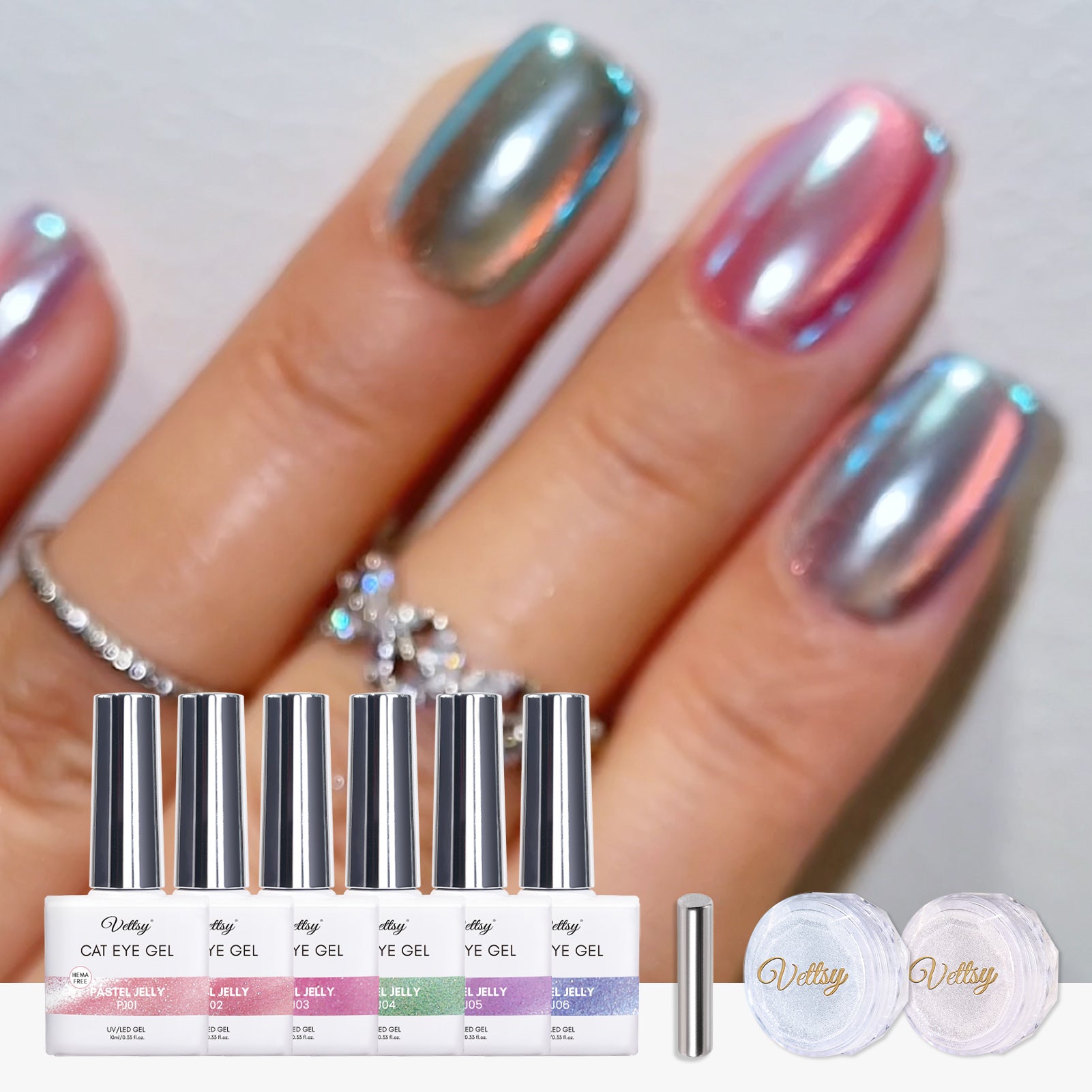 If you love pastel nails but want to try them out in a modern and fun way, try this candy cat eye nail art set. Pastel cat eyes in different shades look soft and sweet. Pair them with the lustrous moonlight nail chrome to make your nails more shiny and gorgeous. It’s suitable for any party and season. No experience required, everything you need to create the ice Y2K candy nail design is in this nail art set. Get it to do colorful glazed cat eye nails now!
